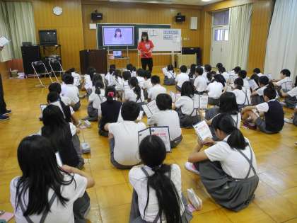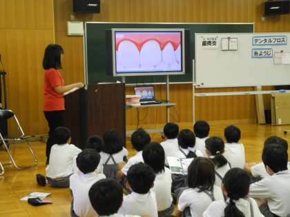 歯茎、歯肉炎について学習しました。デンタルフロスが配られ、使い方を教えてもらいました。