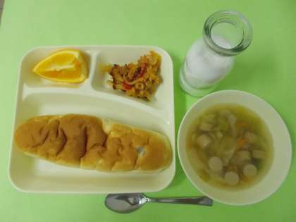 【パエリア・ウインナーとキャベツのスープ・オレンジ・おさつパン・牛乳】