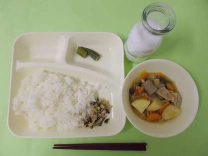 【豚肉とじゃがいもの煮もの・オクラの梅風味・ツナっ葉いため・ごはん・牛乳】