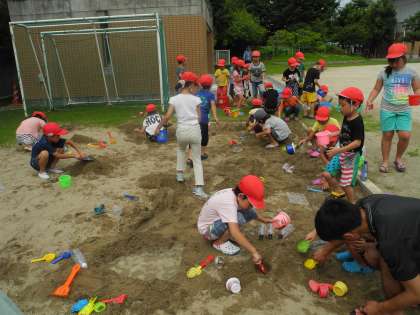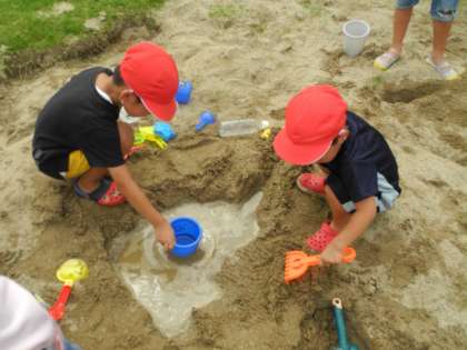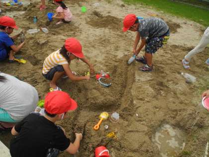 砂を掘って水をためたり、山を作ってトンネルを掘ったりと、お友だちと協力しながら活動することができました!