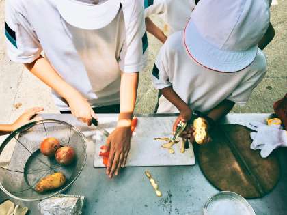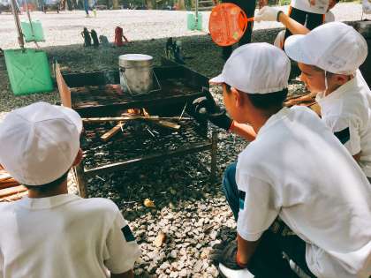 はじめての火起こし。苦戦しながらも、みんなで力を合わせて火をつけることができました。