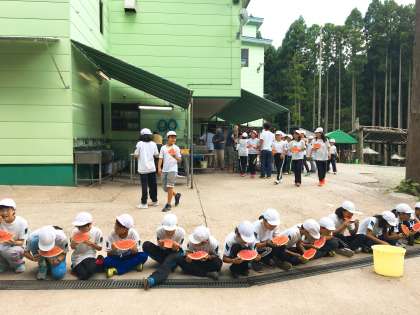 全員で一列に並んですいかを食べました。夏の味覚です。