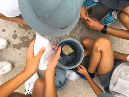 只今、シャーベット作りの真っ最中です。氷に塩を入れるとマイナスまで温度が下がり、シャーベットができるそうです。ほんとかな〜?とみんなわくわくしています。