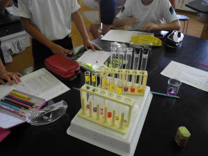 6年生は、理科の実験で、ムラサキキャベツのしるを使って、水溶液の仲間わけをしました。