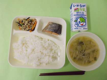 【ごはん・牛乳・さけのしょうゆ風味焼き・五目汁・高野豆腐のいり煮】