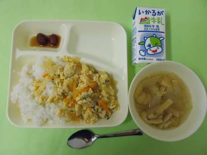 【親子丼・冬瓜のすまし汁・金時豆の煮もの・牛乳】
