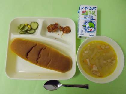 【まぐろのオーロラ煮・スープ・きゅうりとコーンのサラダ・パンプキンパン・牛乳】