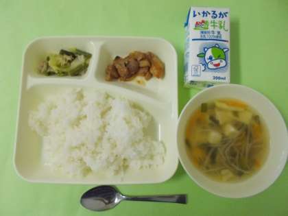 【鶏肉のチリソース焼き・とうふとワンタンの皮のスープ・中華いため・ごはん・牛乳】