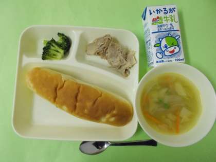 【豚肉のガーリック焼き・マカロニと野菜のスープ・ブロッコリーのサラダ・おさつパン・牛乳】