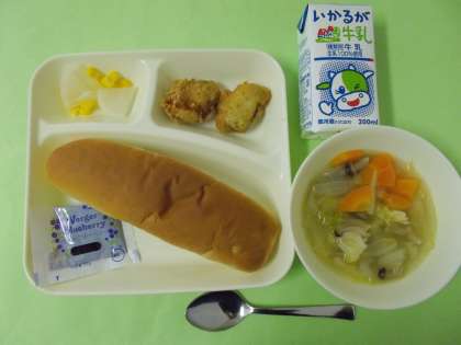 【白身魚のフリッター、スープ煮、だいこんのピクルス、コッペパン、ブルーベリージャム、牛乳】