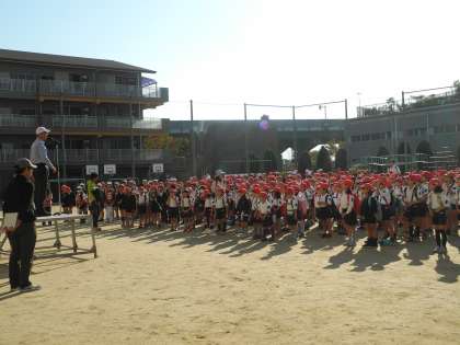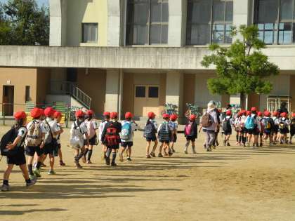今日はウォークラリーです。先ほど、全児童が鶴見緑地へ出発しました。