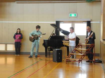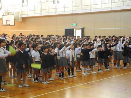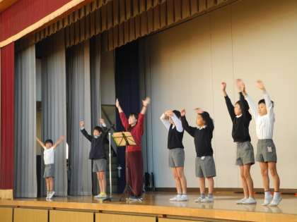 職員の伴奏で、子どもたちは舞台上の振付け隊(2・3年)を見ながら、振付けをして歌いました。