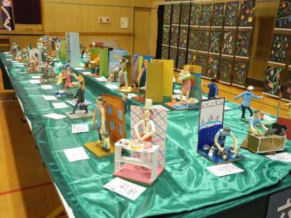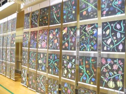 作品展が始まりました。子どもたちの力作が勢ぞろいした講堂。心地よいオルゴールの音を聴きながら、ゆっくりと鑑賞してください。
