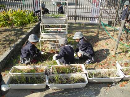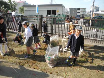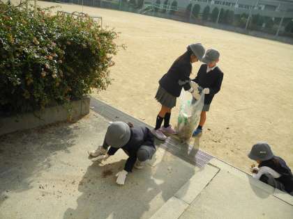 1・2年生は、校内の落ち葉拾いや草抜きをしました。