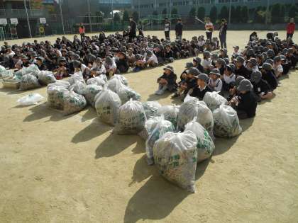 子どもたちが、清掃場所から運動場へ帰ってきました。そして、こんなにたくさんのごみを集めました。それだけ、地域や学校がきれいになりました。