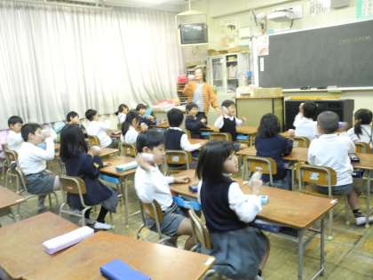 1年生は、音楽の時間に生活科で作ったマラカス(プラスチックの容器の中にどんぐりを2個入れました。)を鳴らしながら、歌を歌いました。