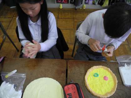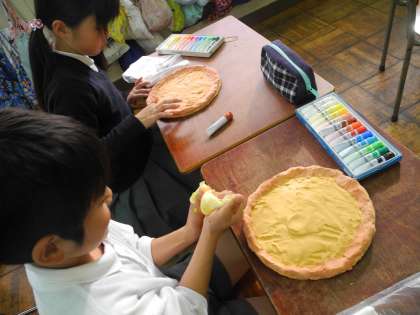 3年生は図工の時間、紙粘土に絵の具を練りこんで、ピザを作りました。