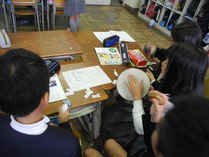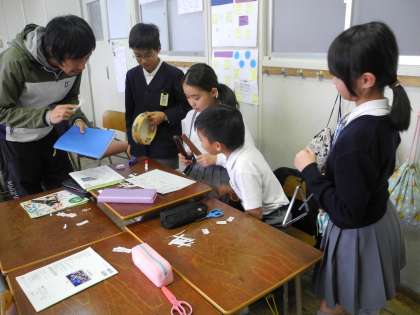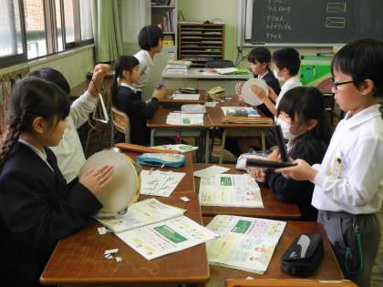 子どもたちは、タンバリン、ウッドブロック、マラカス、トライアングル、クラベス、すずなどの打楽器を使って、グループで楽器を打ちながら音楽を作りました。