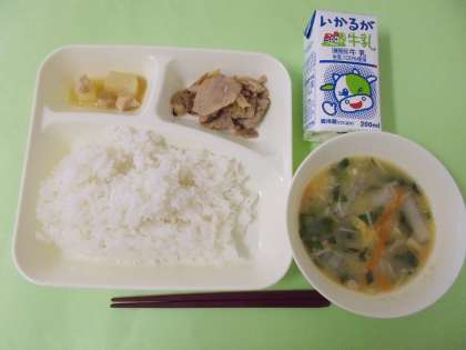 【豚肉の生姜焼き、田辺だいこん葉のみそ汁、田辺だいこんの煮もの、ごはん、牛乳】