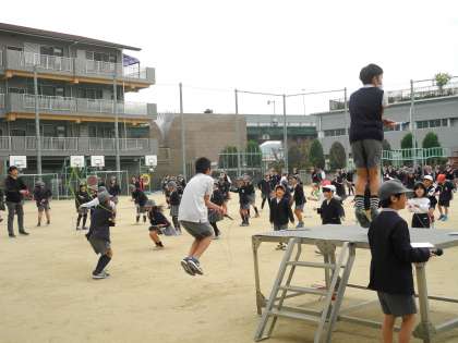 前半は、前とびや後ろとび、あやとびなどをします。後半は、クラスごとに大なわにチャレンジしました。