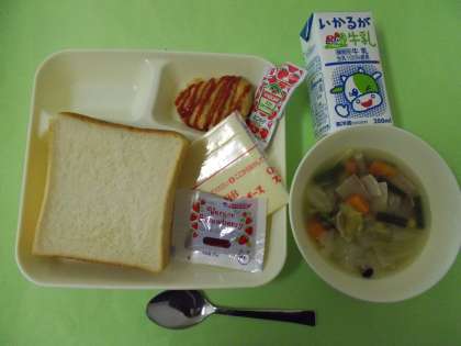 【とうふハンバーグ、スープ煮、スライスチーズ、食パン、いちごジャム、牛乳】