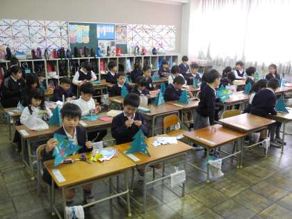 1年生は、色画用紙でクリスマスツリーを作りました。