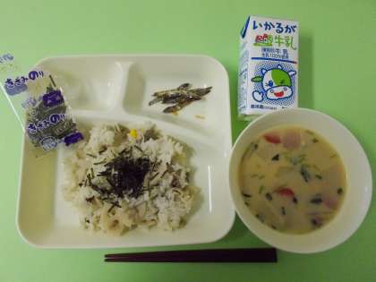 【れんこんのちらしずし、ぞう煮、ごまめ、牛乳】