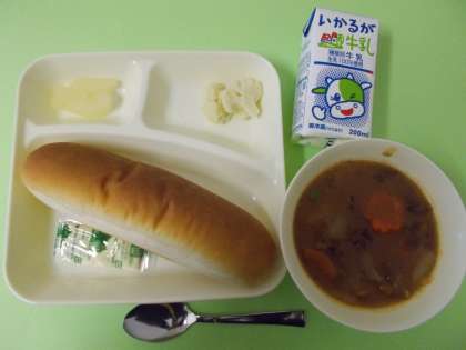 【ビーフシチュー、カリフラワーのピクルス、和なし(缶づめ)、コッペパン、マーガリン、牛乳】