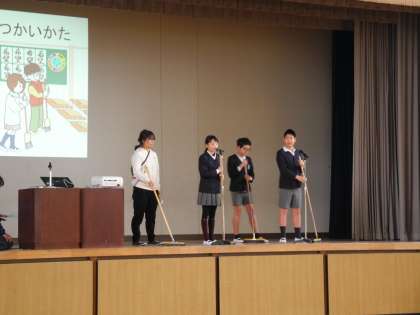 ほうきの使い方や雑巾の絞り方など、委員会の子どもたちがわかりやすく手本を示してくれました。