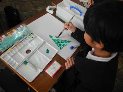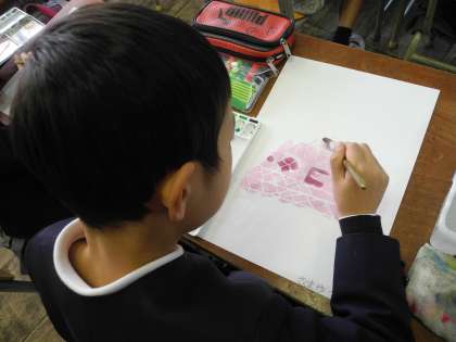 パスの油分で水分をはじくので、絵の具には、少し多めの水を混ぜました。とても楽しい活動でした。