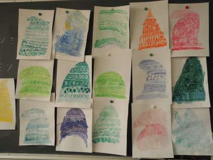 画用紙に白いパスで帽子をかき、その上から絵の具で色を塗りました。