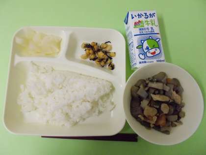 【筑前煮、ひじき豆、だいこんのゆず風味、ごはん、牛乳】