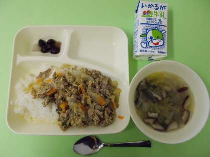 【他人丼、すまし汁、黒豆の煮もの、牛乳】