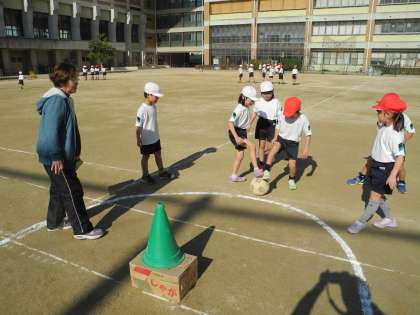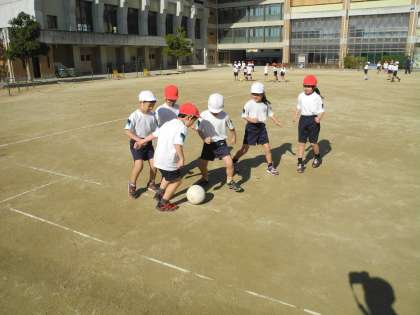 1チーム3人で、ゲームをしています。子どもたちは、夢中でボールを追いかけていました。
