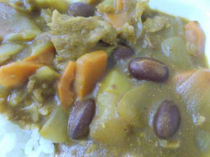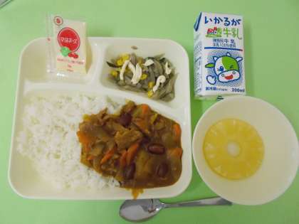【豚肉と金時豆のカレーライス、ごぼうサラダ、パインアップル(缶)、牛乳】