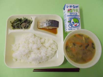 【さごしのしょうゆだれかけ、みそ汁、水菜の煮びたし、ごはん、牛乳】