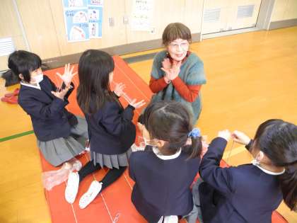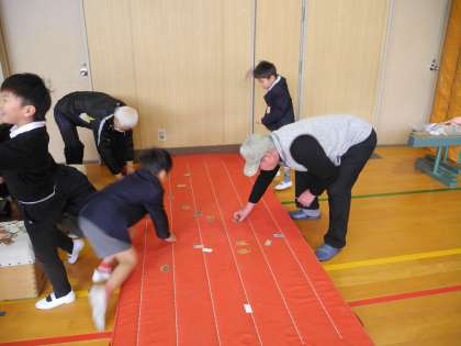 写真は、「あやとり」と「めんこ」をしている様子です。