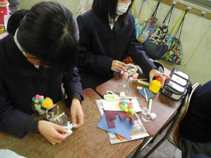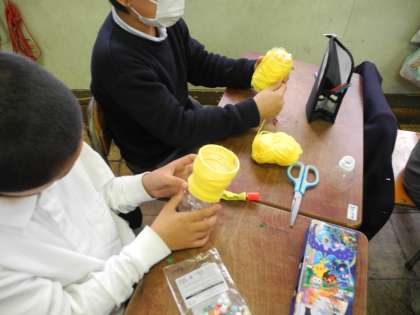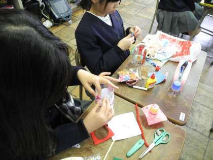 家庭科クラブでは、ペットボトルを使ってペン立てを作りました。