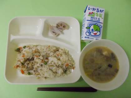 【鶏ごぼうごはん、干しずいきのみそ汁、焼きれんこん、牛乳】