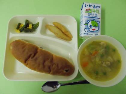 【わかさぎフライ、スープ煮、三度豆とコーンの甘酢あえ、レーズンパン、牛乳】