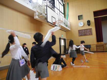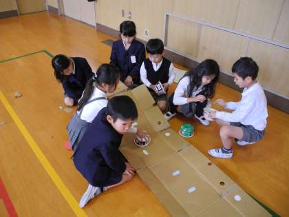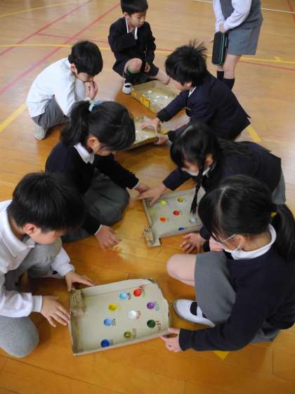 1年生は、2年生の話をよく聞いて、手作りのおもちゃで楽しく遊びました。
