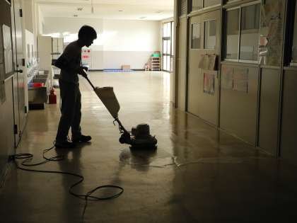 管理作業員さんが廊下の床を磨き、ワックスをかける作業をしています。
