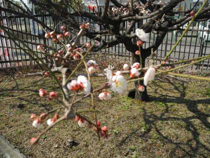 西門の梅の花が咲き始めました。一本の木に紅白の梅が咲きます。