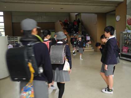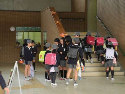 あいさつ隊が、登校する児童に挨拶をしました。