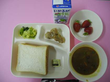 フライドチキン、カレーシチュー、春のカラフルソテー、いちご、パン、バター、牛乳