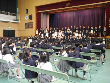 今日の20分休みに、公開練習をしました、たくさんの子どもたちが講堂に来て、1年生の一生懸命な姿を静かに見守りました。