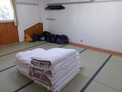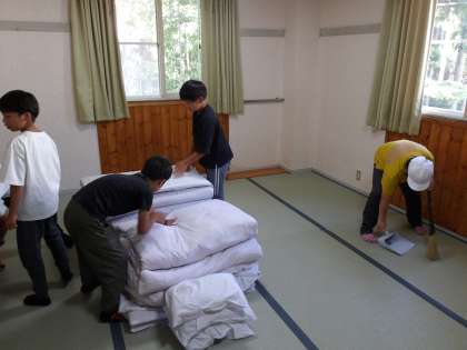 荷物をまとめて、布団やまくらをきれいに並べてます。