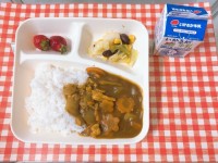 2学期の給食が始まりました。8月の給食は、暑い中でも子どもたちが食べやすいメニューになっています。今日のビーフカレーライスには、お魚と猫の形になったラッキーにんじんが入っていました。