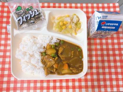 【チキンカレーライス、キャベツとコーンのサラダ、ミニフィッシュ、牛乳】