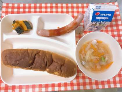 【ウインナーのケチャップソース、スープ、焼きかぼちゃ、おさつパン、牛乳】